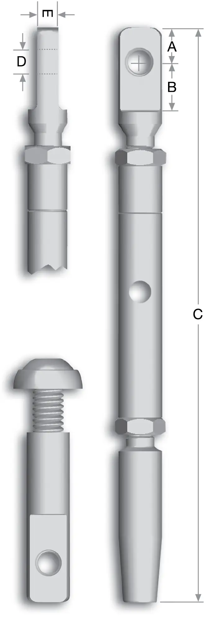 Electroline’s Architectural Classic Turnbuckle is used to create tension in the wire railing for stairways and straight runs by attaching the eye to another eye fitting. The swageless termination allows it to be quickly attached to the end of a wire, with the other end anchored into the post. The body is rotated to tension the cable railing.